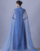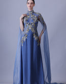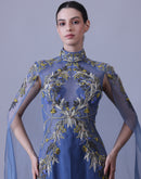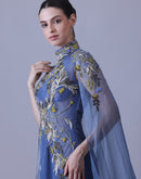 Blue Gown with Artisanal Embroidery and Ethereal Cape Sleeves