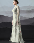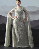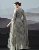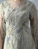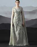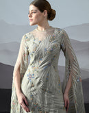 Soft Grey Gown with Handworked Floral Trails, and Sheer Overlay