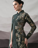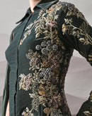 A sculpted deep green gown defined by clean tailoring and delicate botanical embroidery, offering understated elegance for intimate celebrations and evening occasions. Fabric: VelvetEmbroidery: Hand-embroidered floral motifs with fine detailingColour:...