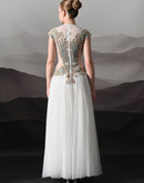 A delicately contoured bodice adorned with intricate tonal embroidery flows into a softly pleated skirt, creating a light and graceful movement through refined craftsmanship.