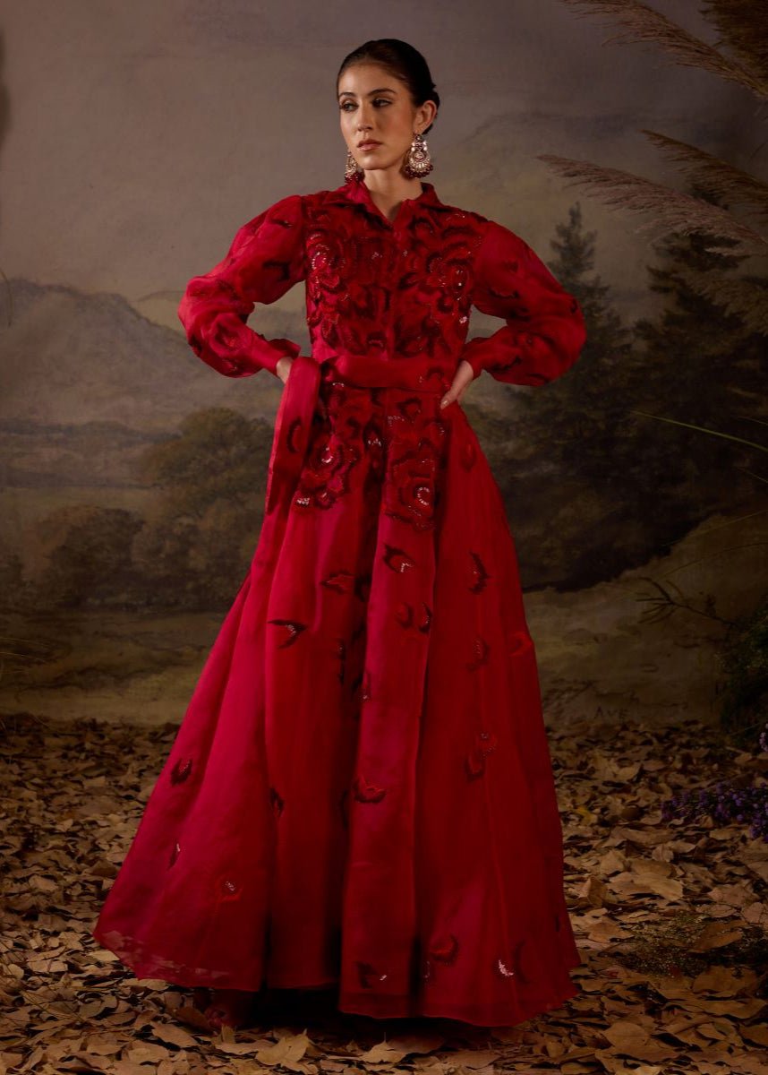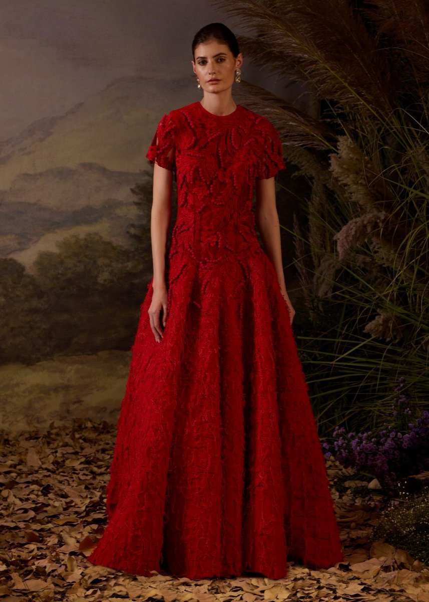 Drape yourself in timeless elegance with this scarlet red gown, featuring exquisite floral silk thread embroidery, a belted waist, and sheer puff sleeves