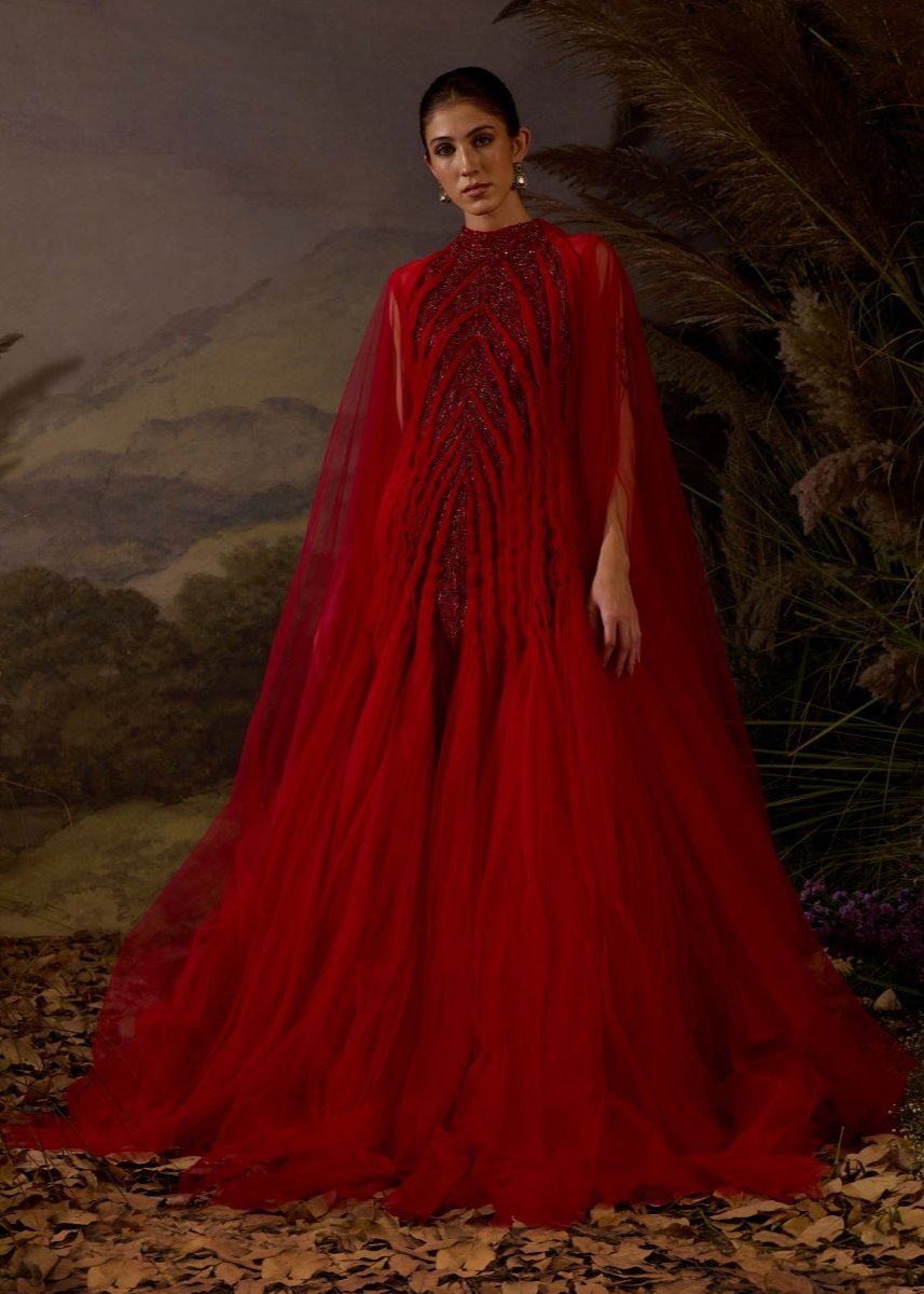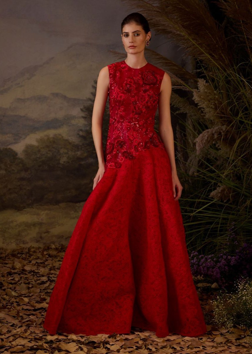 A Red chiffon & cotton silk gown with an embroidered tonal texture in bottom and 3d zardozi and silk thread embroidery in torso