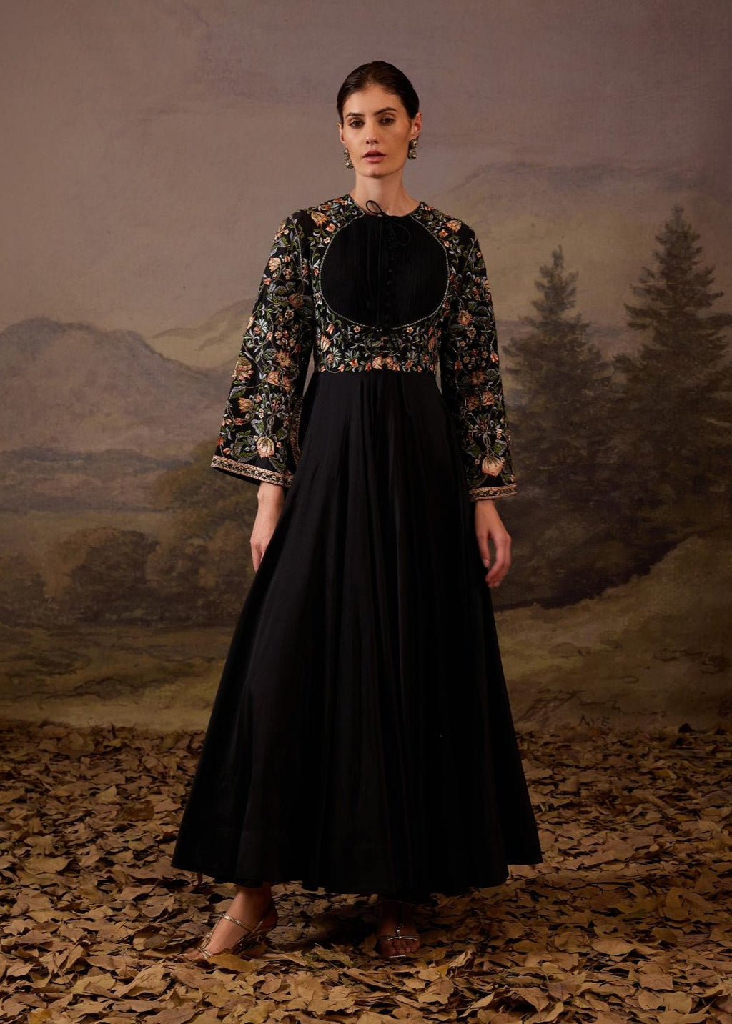 A sophisticated black gown with rich, colorful floral embroidery on the structured top and sleeves, contrasting with a plain, full A-line ghera.