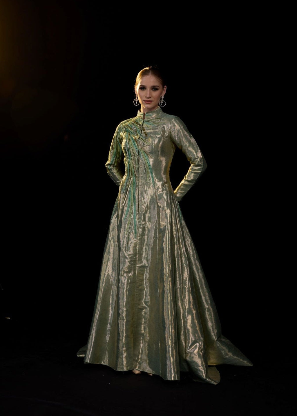 Elevate your evening look with this full-length metallic olive gown featuring a high collar, structured bodice on lurex fabric,