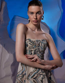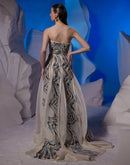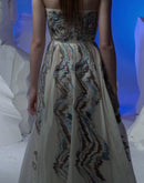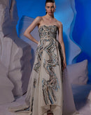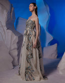 Elegant ivory cotton silk off-shoulder gown featuring a box pleat at the waist and adorned with colorful silk thread and Zardozi embroidery.