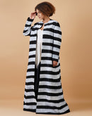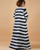 A black cotton silk floor-length jacket with block printed along with embraided neck inner