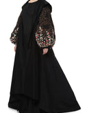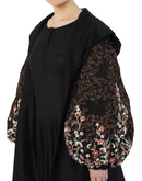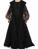 Fully embroidered balloon sleeves in thread and pearl with wide round collar of a jacket dress that is openable in the front and is paired with black cotton inner dress.