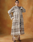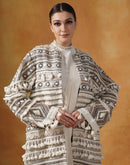 Featured here is a bohemian style long front open jacket in linen silk base that is covered in thread embroidery and tassels. It is topped on an ivory cotton silk drape dress