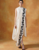Embroidered bohemian style long jacket in linen silk, topped on an ivory cotton silk drape dress