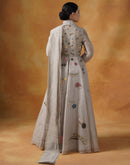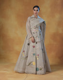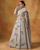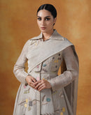 Embroidered A-line linen silk gown which has a collared neck with a pallu that is attached at the waist.