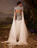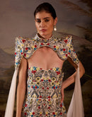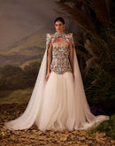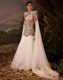 Make a statement with this ethereal cape gown featuring intricate floral embroidery on the bodice and structured shoulders. The voluminous tulle ghera adds a dreamy with colorful silkthread and dardozi embroidery