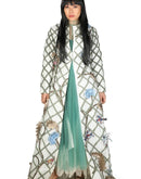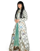 The outfit is a set of three that includes a cotton slip that is topped with a net ombre dress. Finishing the look is the Ivory floor-length, round neck cotton silk jacket that is distinctively embroidered in zardozi, silk yarn and dori.