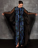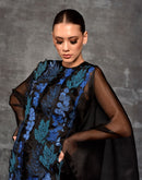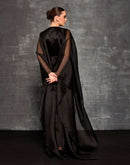 This exquisite formal dress features a striking silhouette with a full-length, flowing black cape that drapes elegantly from the shoulders Fabric: Organza silk Embroidery details: Silk thread & zardozi embroidery...