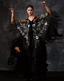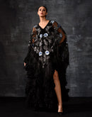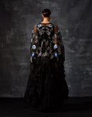 Make a dramatic entrance in this flowing black kaftan with inner gown featuring delicate floral embroidery in shades of blue and white. The sheer overlay is accentuated with fringed edges