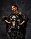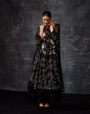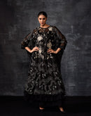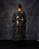 black organza fabric ensemble features a flowing, sheer kaftan adorned with exquisite white and silver floral and botanical embroidery that cascades elegantly down the fabric. Along with inner dress