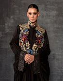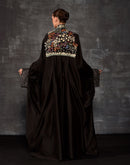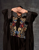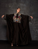 Black majestic black abaya features a striking high-collar design and dramatic, wide sleeves, multicolor embroidery