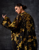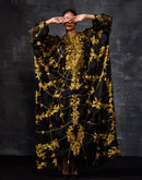 this stunning black sheer kaftan, featuring intricate gold leaf embroidery throughout. Crafted for comfort and sophistication, this free-size silhouette drapes gracefully