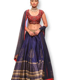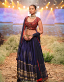 Red and navy lehenga set that showcases beautiful hand-embroidery on cotton silk blouse paired with block printed Lehenga in dupion silk & embroidered dupatta in net.
