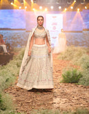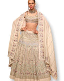 Ivory base, heavily embroidered lehenga set in rib cotton silk along with beautifully embroidered dupatta in the same fabric. The embroidery showcased is in pastel shades of silk yarn and zari.