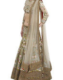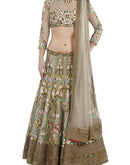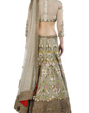 An intricately embroidered Apple Green Cotton Silk  Lehenga & blouse set paired with a Net dupatta highlighted by silk yarn & zari work.