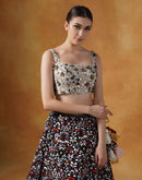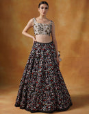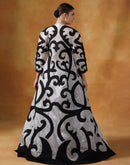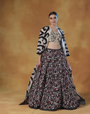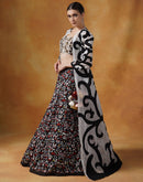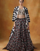 Featured here is a white organza jacket with black appliqué work. It is topped over a lehenga set with embellished beige blouse and embroidered black skirt.