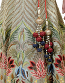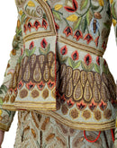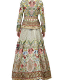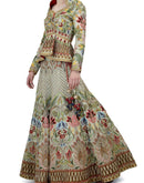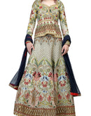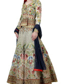 Featuring an ivory floral embroidered cotton silk overlap blouse & lehenga paired with a navy mesh dupatta.