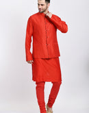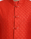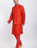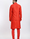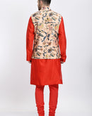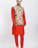 A cotton silk red kurta with matching cotton churidar that is topped with a reversible waist coat which is surfaced with digital print on peach base and quilted texture.