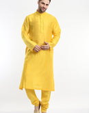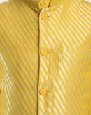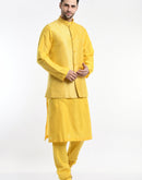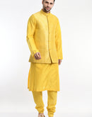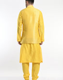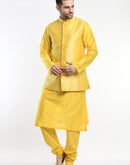 A cotton silk yellow kurta with matching cotton churidar that is topped with a waist coat which is surfaced with silver diagonal lines pattern.