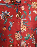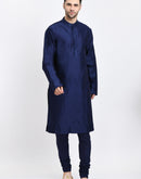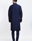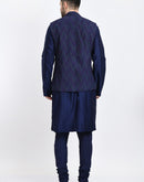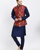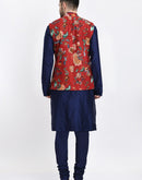 A cotton silk navy blue kurta with matching cotton churidar that is topped with a reversible waist coat which is surfaced with digital print on red base and quilted texture.