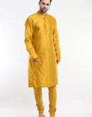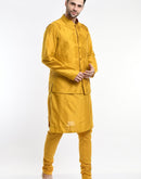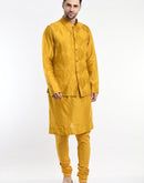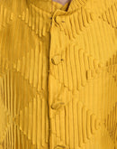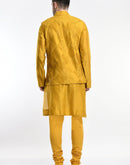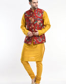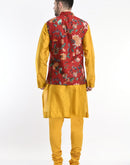 A cotton silk yellow kurta with matching cotton churidar that is topped with a reversible waist coat which is surfaced with digital print on red and quilted texture.
