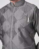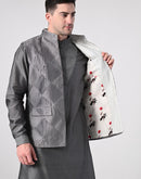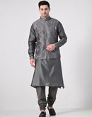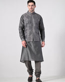 Achieve a refined ethnic look with this charcoal grey kurta churidar set, paired with a delicately embroidered Nehru jacket. Crafted for modern elegance, it's an ideal choice for weddings, festive events, and formal celebrations.