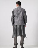 charcoal grey kurta churidar set, paired with a delicately embroidered Nehru jacket