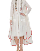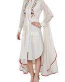 Ivory cotton silk shirt dress with a front zipper and tie up and an attached cape layer at the back, It is embroidered in silk yarn, sequins & zari work....