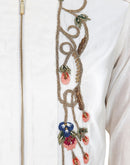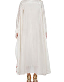 Ivory cotton silk shirt dress with a front zipper and tie up and an attached cape layer at the back, It is embroidered in silk yarn, sequins & zari work.