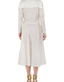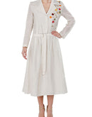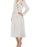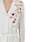 Ivory calf-length front tie-up belt jacket style Cotton Silk Dress with floral applique & thread work.