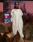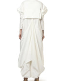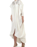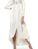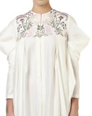 Ivory front-opening draped hemline cotton silk Dress embroidered yoke in floral motifs of silk yarn.