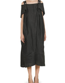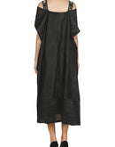 Black front-opening off-shoulder flap chanderi dress shoulder straps hand embroidered in sequins & beads.