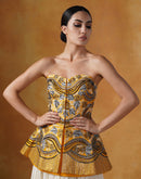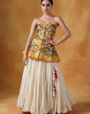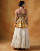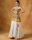 A yellow cotton silk peplum corset top , intricately embroidered in silk yarns and bead work and is paired with a pleated cotton Ivory skirt. Beautiful latkans hanging from the skirt add to the beauty.