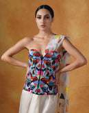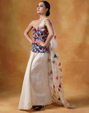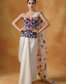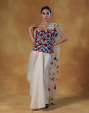 Corset that is intricately embroidered in colorful beads, decorated with a printed pallu and is paired with a plain white cotton silk drape skirt.