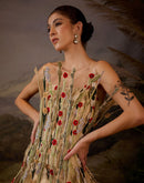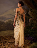 Exude grace in this ivory corset gown featuring exquisite floral embroidery. The structured bodice contrasts beautifully with the soft, flowing drape skirt, creating a silhouette that is both bold and...