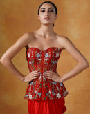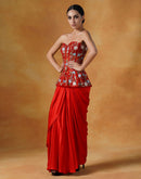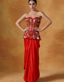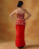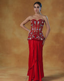 A red organza corset top that is fully embroidered and paired with a satin drape skirt.