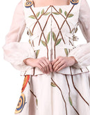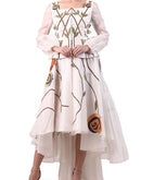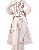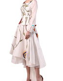 Ivory asymmetric cotton silk dress surfaced with detailed floral motifs of silk yarn & zari embroidery. The top of the dress is given a peplum jacket style with small bands adding beauty.