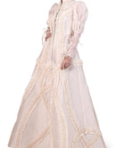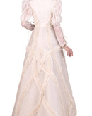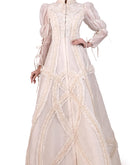 Ivory high-collared, elongated puff-sleeves front-opening jacket style floor-length cotton silk gown highlighted in tone-on-tone embroidery & ruffle, tie-up sleeves.