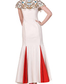 Ivory panelled cotton silk gown with cape shoulders, embroidered in silk yarn & zari work.