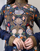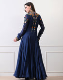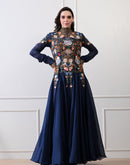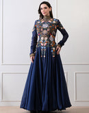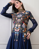 This elegant blue floor-length anarkali-style dress features full sleeves and a round neckline, offering a classic silhouette. The bodice is richly embroidered with an intricate tapestry of florals and foliage in vibrant shades
