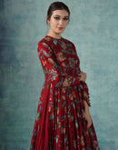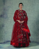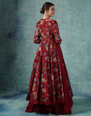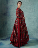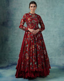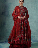A red cotton silk Anarkali surfaced with digital prints and dabka hand work. It comes with a voluminous cotton lining inside and a matching organza Dupatta which is scalloped at the borders.