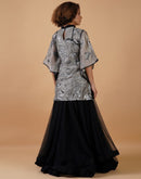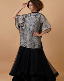 A floor length dress that is made in linen silk from top till the knees along with wide sleeves and is further extended in net, creating asymmetric ruffle. The dress...