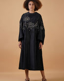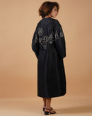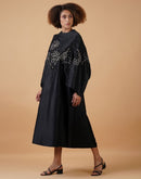 A lose-fit black cotton silk dress with silver embroidery flowers beautifully yoke