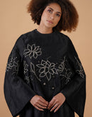 A lose-fit black cotton silk dress with silver zardosi flowers beautifully embroidered on the yoke..