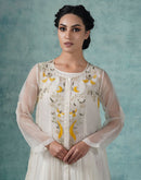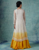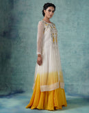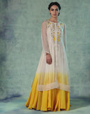 An ombre dyed Anarkali cotton slip is topped with an organza jacket that is beautifully embroidered in the front and has an openable front.
